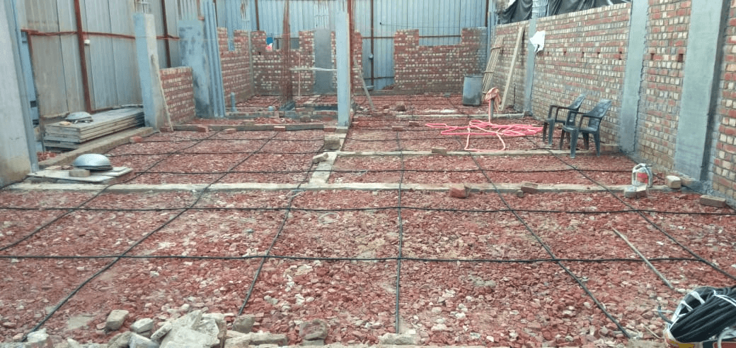 • A grid of slotted and solid PVC pipes is laid on the prepared ground before the concrete slab is poured.